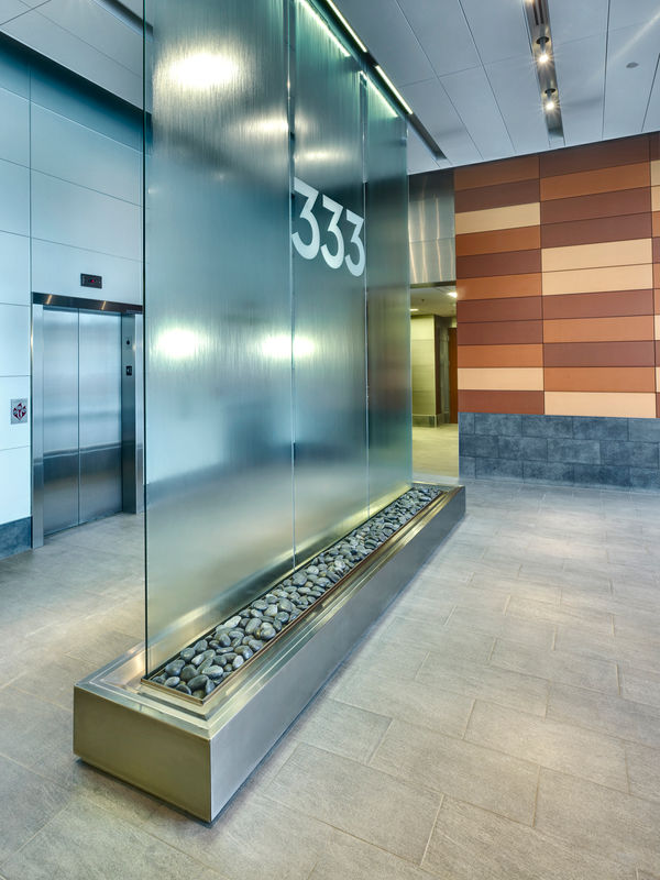 The 6-story Class A office building includes 4,300 SF of first floor retail space responding to the cityscape. A hidden challenge of the former train station site was the poor foundation conditions, including underground tunnels and debris, that prevented underground parking. The building program provided 45 on-grade outdoor parking spaces.