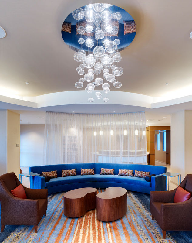 QPK Design planned and designed this 4-story custom Springhill Suites for 119 guest rooms complete with fitness center, pool with outdoor lounge area, and large oval gathering area adjacent to reception.