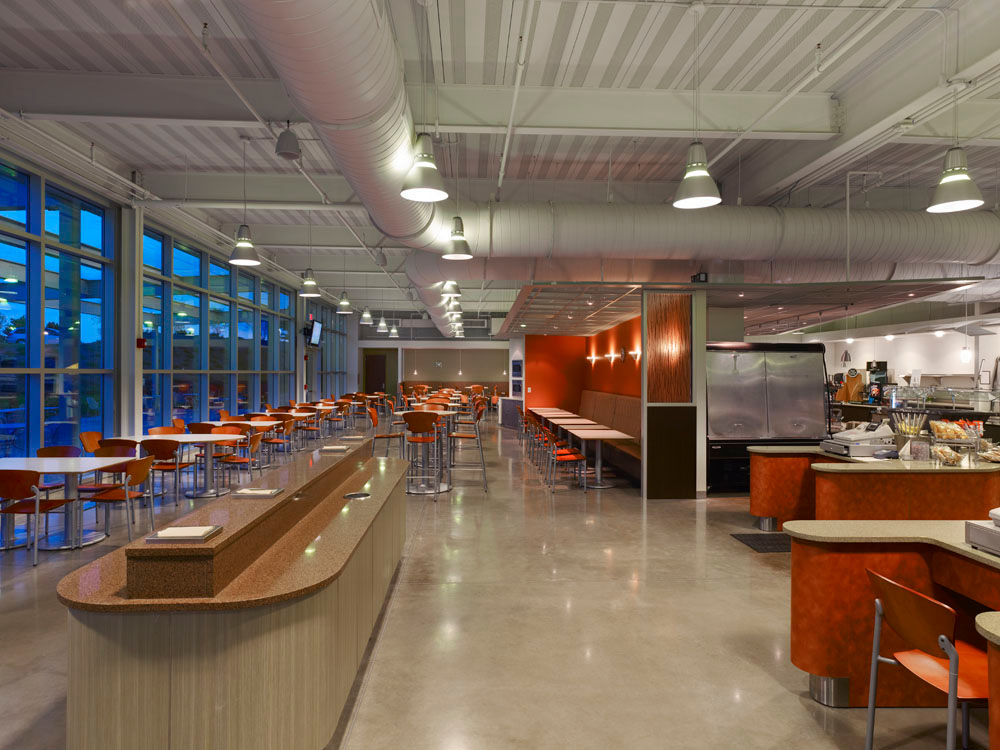 A multi-story atrium, with a water feature below, forms the centerpiece for visitors and employees. Through specialized daylight and energy modeling, custom “light scoops” harvest daylighting with integrated LED lighting controls. The modeling provided design parameters for the prismatic skylights with splayed light wells to maximize both daylight distribution and diffusion to reduce glare. Combined with the building management control system, energy usage and costs were reduced.