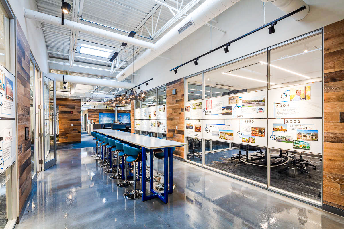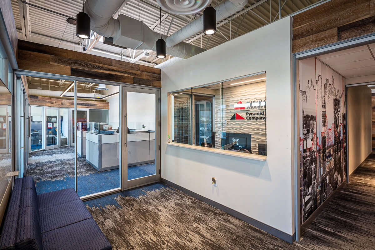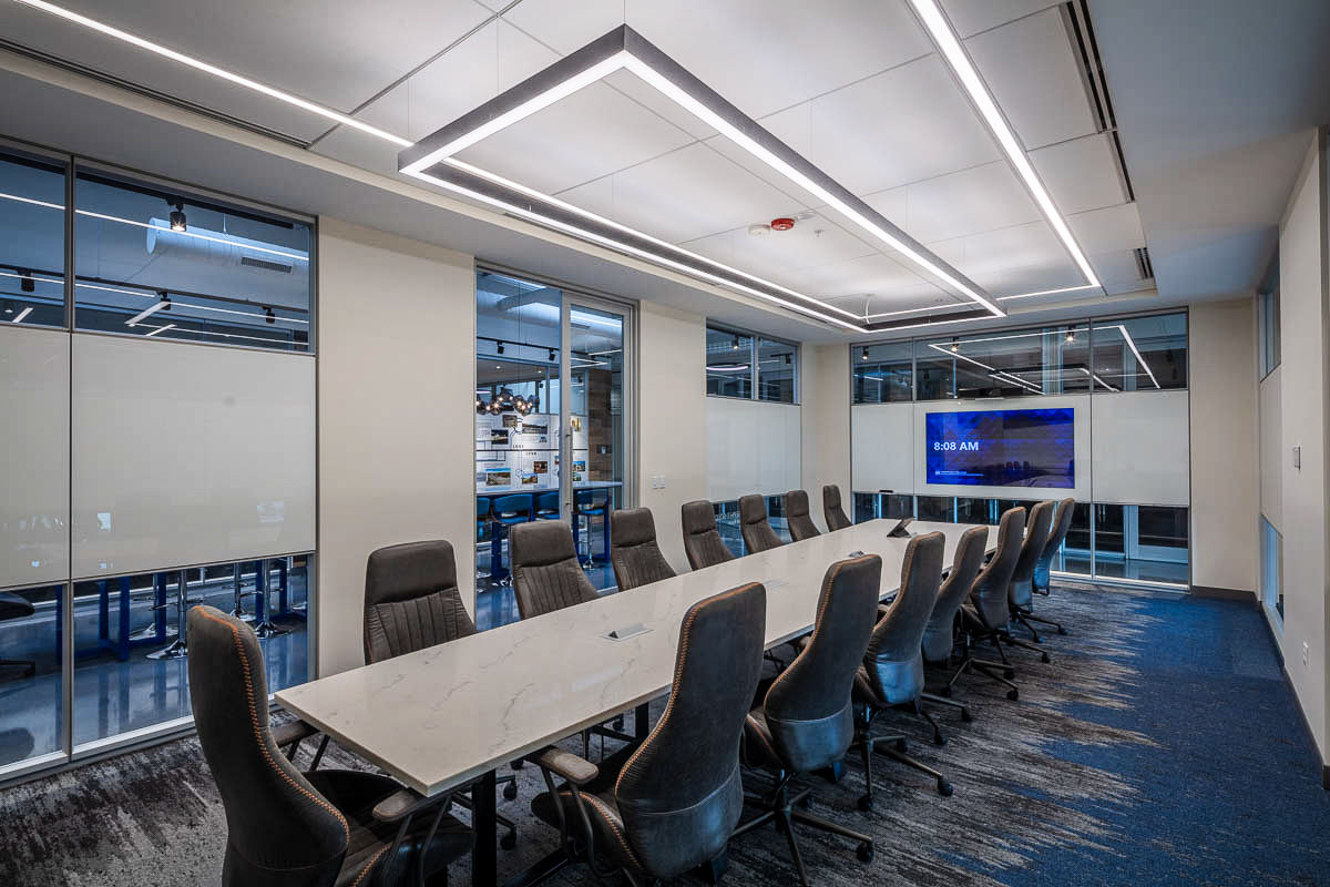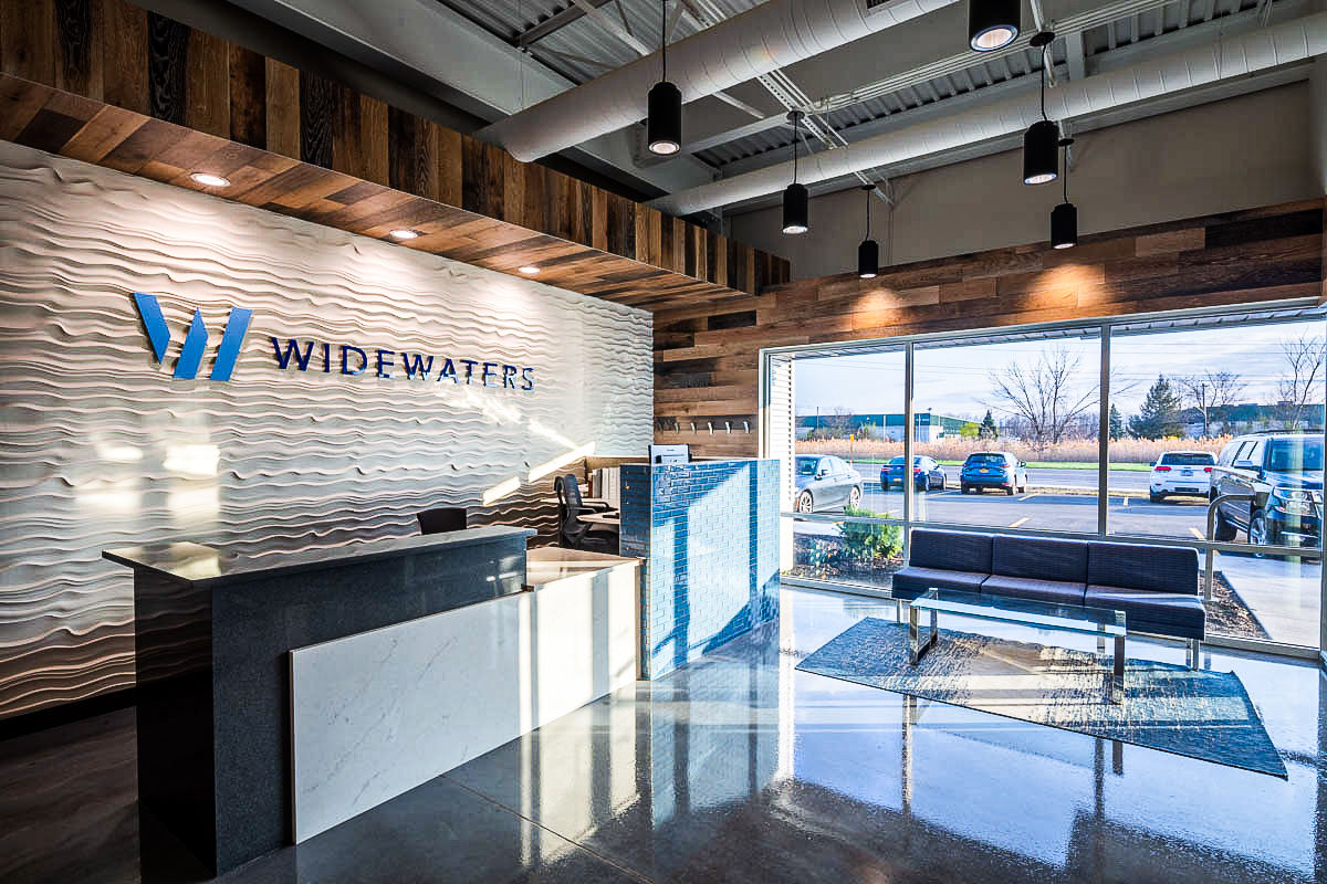 QPK provided planning and design services to relocate Wide Waters Headquarters to one of their new multi-tenant office buildings in East Syracuse. Wide Waters was ready for an update from their prior formal aesthetic of mahogany lined walls and enclosed spaces desiring a transformation to a contemporary, open and invigorating environment. The program consisted of private offices with areas of open plan workstations, collaboration areas, training and meeting spaces. Strategic placement of program elements allows for an abundance of natural light and views to all. The primary partition system reinforced both openness and opportunity to showcase the company’s portfolio through the system’s changeable paneled graphics. Wood accent walls add warmth and balance to the cool blue and grey color scheme. Ceiling remained open to the structure along circulation paths and above internal office clusters to maximize the height and open feel of space.